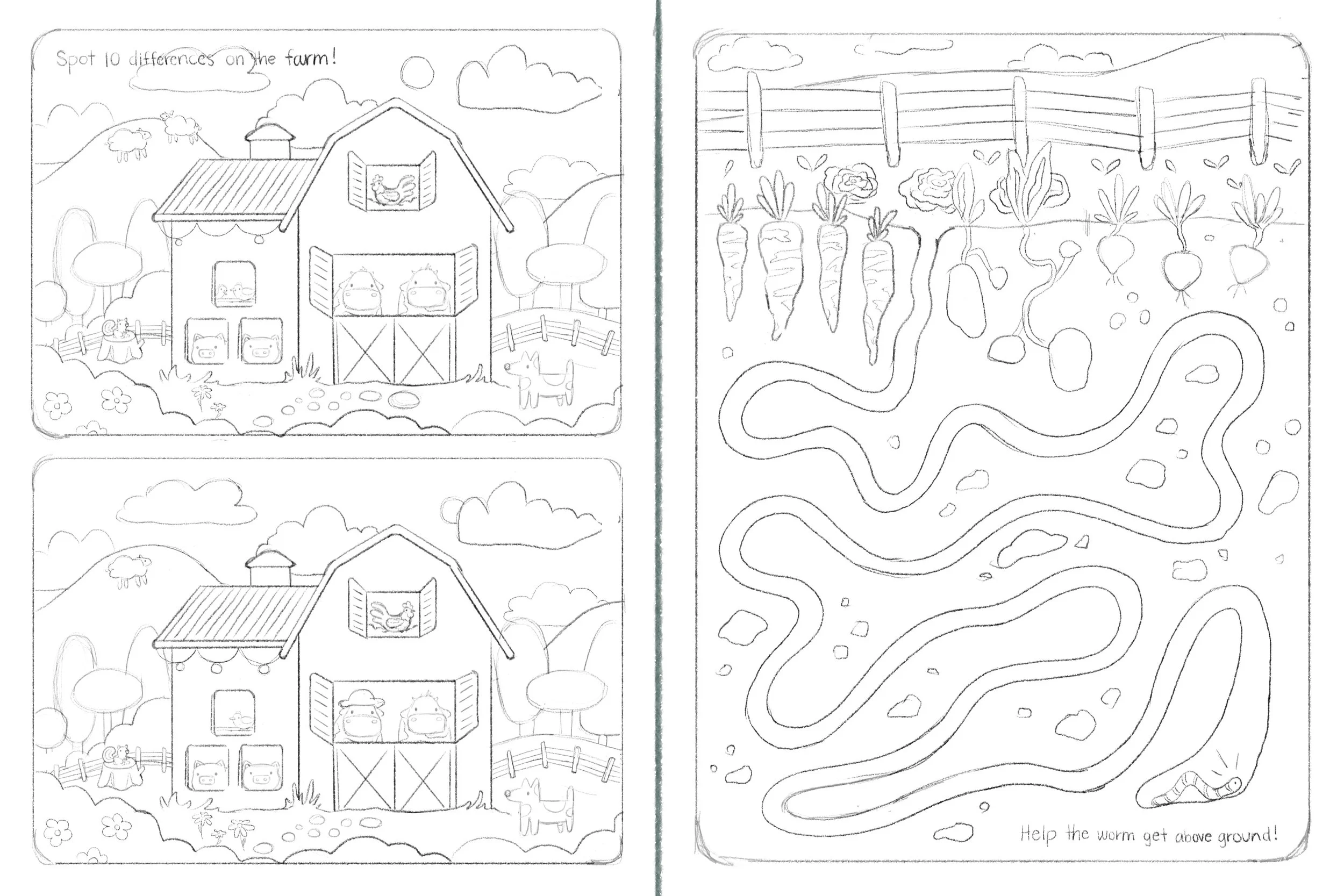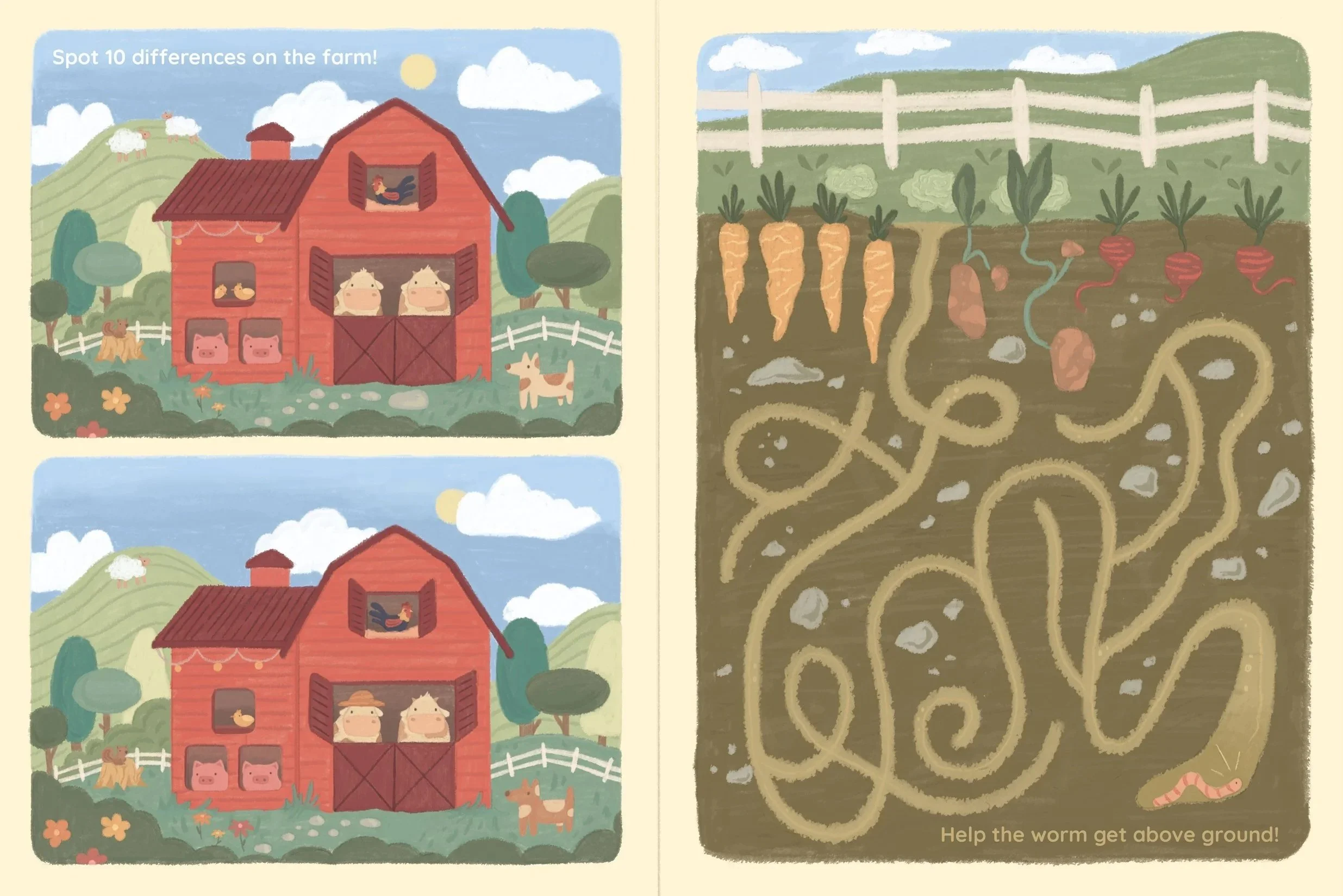 This farm-themed activity page has two fun challenges! On the left, kids compare two barnyard pictures and spot 10 differences. On the right, they guide a worm through an underground maze to reach the vegetables above. The goal is to build observation and problem-solving skills while having fun.