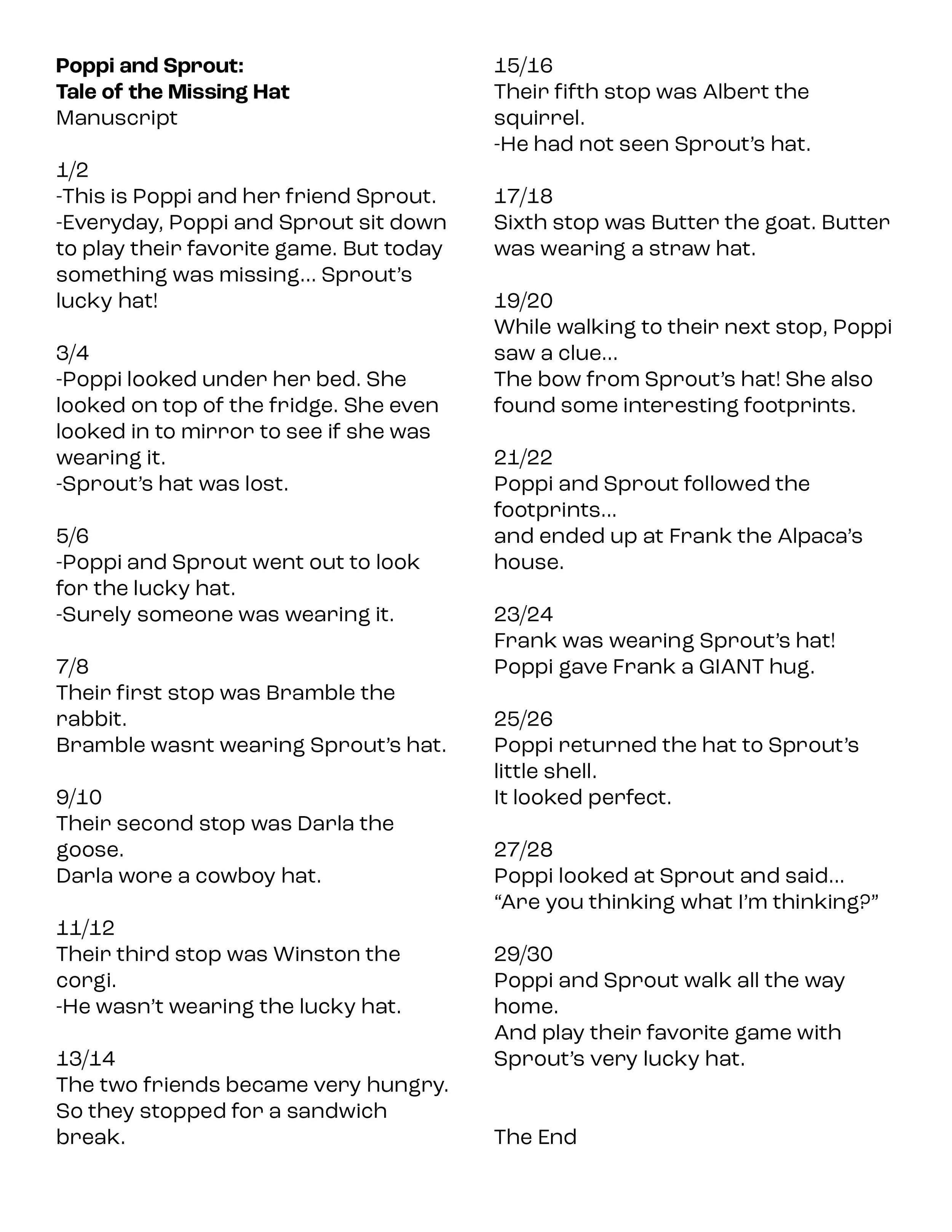 “Poppi and Sprout: Tale of the Missing Hat" (260 words) is a picture book about a little girl named Poppi and her turtle friend, Sprout. When Sprout's lucky hat goes missing, their usual afternoon game turns into an unexpected adventure.